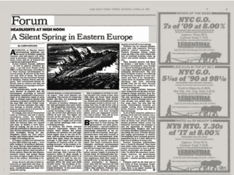 Across Eastern Europe, pollution – as well as general economic decline – are the Grim Reaper of the 1980’s. In East Germany, according to a West German environmental research group, 90 percent of the trees are sick, dead or dying. The human mortality rate has increased sharply in Hungary, Poland, Russia and Bulgaria, and environment-related illnesses such as cancers and skin and heart diseases are soaring in all Eastern bloc countries.