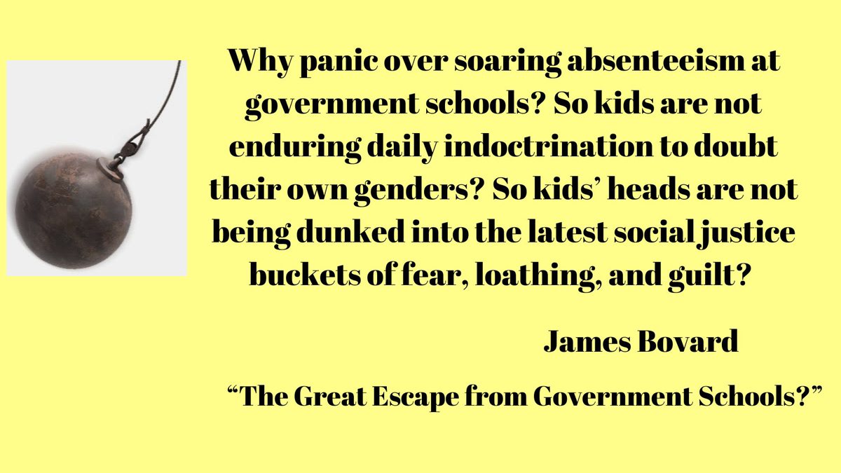 After enduring bullshit school shutdowns during the COVID pandemic, many students concluded that school itself must be bullshit and have skipped attending classes. Government bureaucrats are panicking since subsidies are tied to the number of students’ butts in chairs each day. Duke University Professor Katie Rosanbalm lamented that, thanks to the pandemic, “Our relationship with school became optional.”