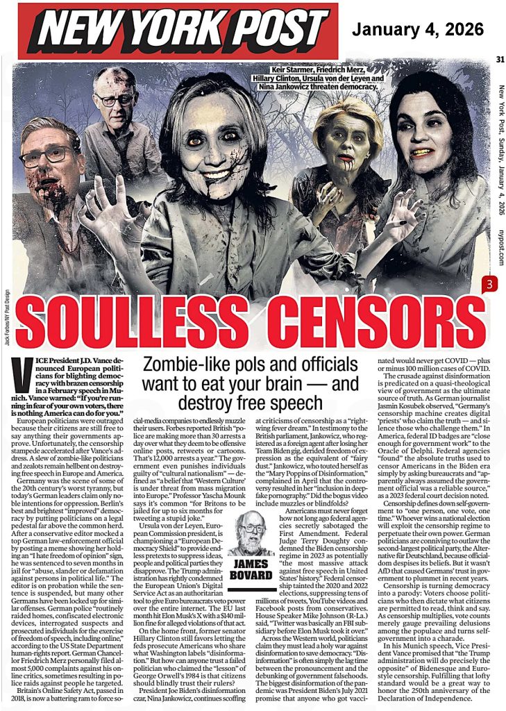 N.Y. Post: Soulless Censors By Jim on January 4, 2026 0 Alliance fur Deutschland (AfD), Biden, Britain, censorship, Democracy, Democracy Shield, Elections, Elon Musk, Euroepean Union, George Orwell, hillary clinton, Mary Poppins, Merz, Mike Johnson, Nina Jankowicz, Starmer, Terry Doughty