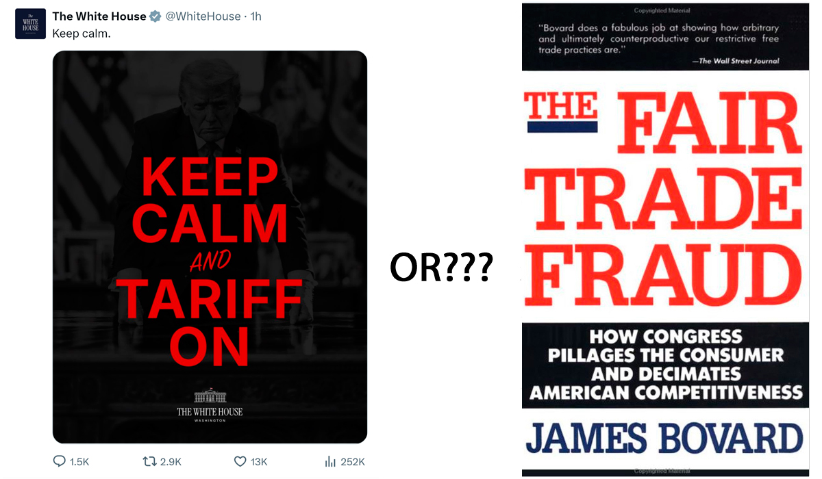 In a press conference today, Trump proclaimed: “I can destroy the [foreign] country.” Trump was outraged that the Supreme Court struck down his primary tariff scheme as an illegal abuse of power. Vice President Vance condemned the “lawlessness” of the decision – as if any limit on Trump’s dictatorial power over imports was lawless. How did economic policy get so deranged? Here are some of my potshots at tariffs over the years, spurred in part by my 1991 book, The Fair Trade Fraud (St. Martin’s Press).  The tweet from the White House on “Keep Calm” spurred this blog post.
