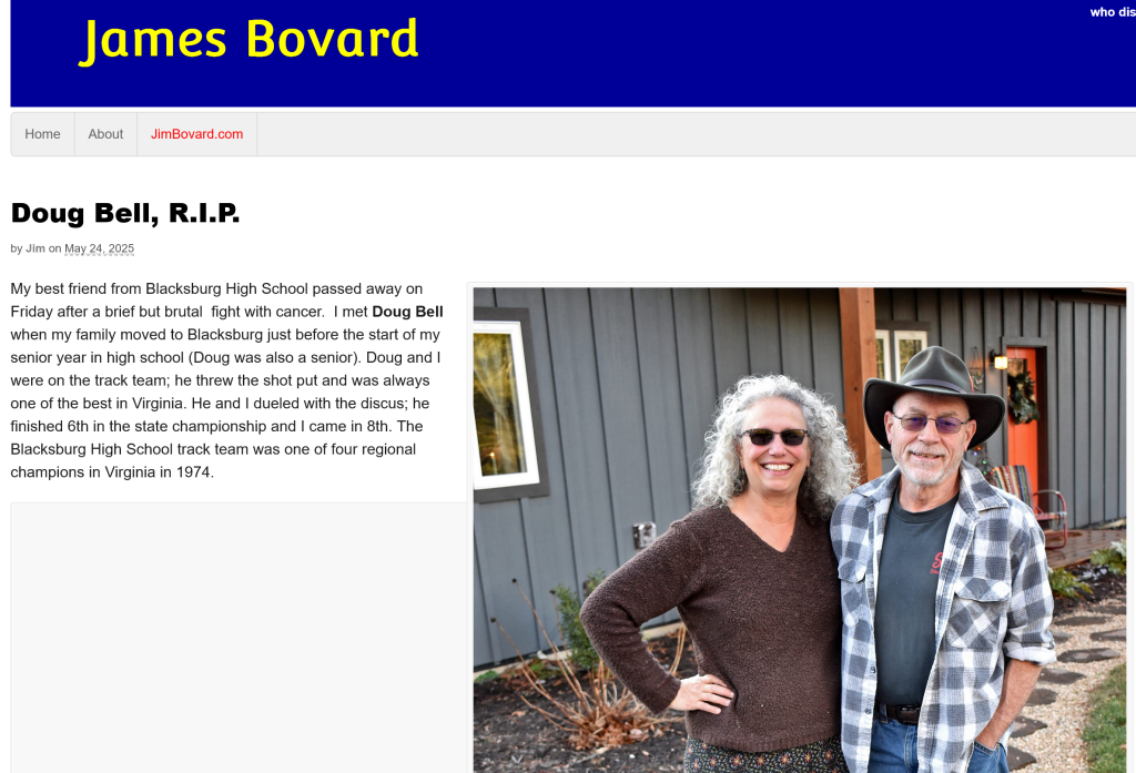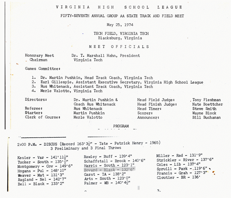 After that contest, I shifted my sports zeal to throwing discus, which I thought was my best chance to snare a scholarship to college. (Didn’t happen). After my family moved to southwest Virginia, I became good friends with Blacksburg High School classmate Doug Bell, one of Virginia’s top shotputters. He and I dueled with the discus all season long. At the state championship track meet the following May, he finished 6th and I came in 8th. A few weeks later, I finished second in discus at the state Junior Olympics championship.