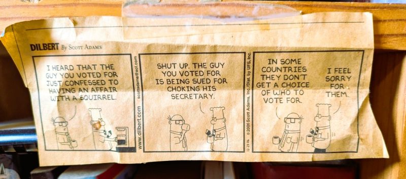 Wally replies: “In some countries, they don’t get a choice of who to vote for.” Dilbert concurs: “I feel sorry for them.”