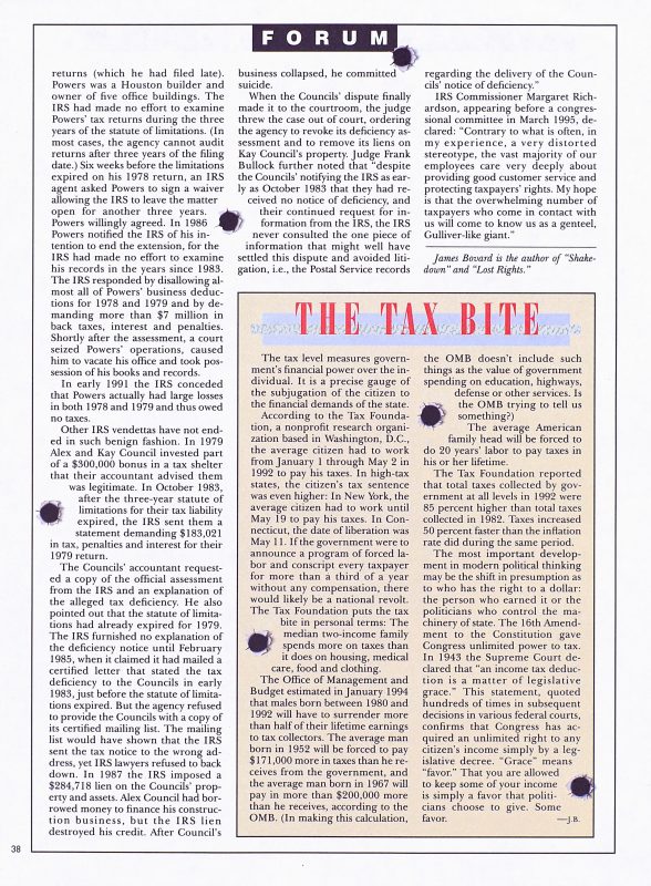 The Councils’ accountant requested a copy of the official assessment from the IRS and an explanation of the alleged tax deficiency. He also pointed out that the statute of limitations had already expired for 1979. The IRS furnished no explanation of the deficiency notice until February 1985, when it claimed it had mailed a certified letter that stated the tax deficiency to the Councils in early 1983, just before the statute of limitations expired. But the agency refused to provide the Councils with a copy of its certified mailing list. The mailing list would have shown that the IRS sent the tax notice to the wrong address, yet IRS lawyers refused to back down. In 1987 the IRS imposed a $284,718 lien on the Councils’ property and assets. Alex Council had borrowed money to finance his construction business, but the IRS lien destroyed his credit. After Council’s business collapsed, he committed suicide.