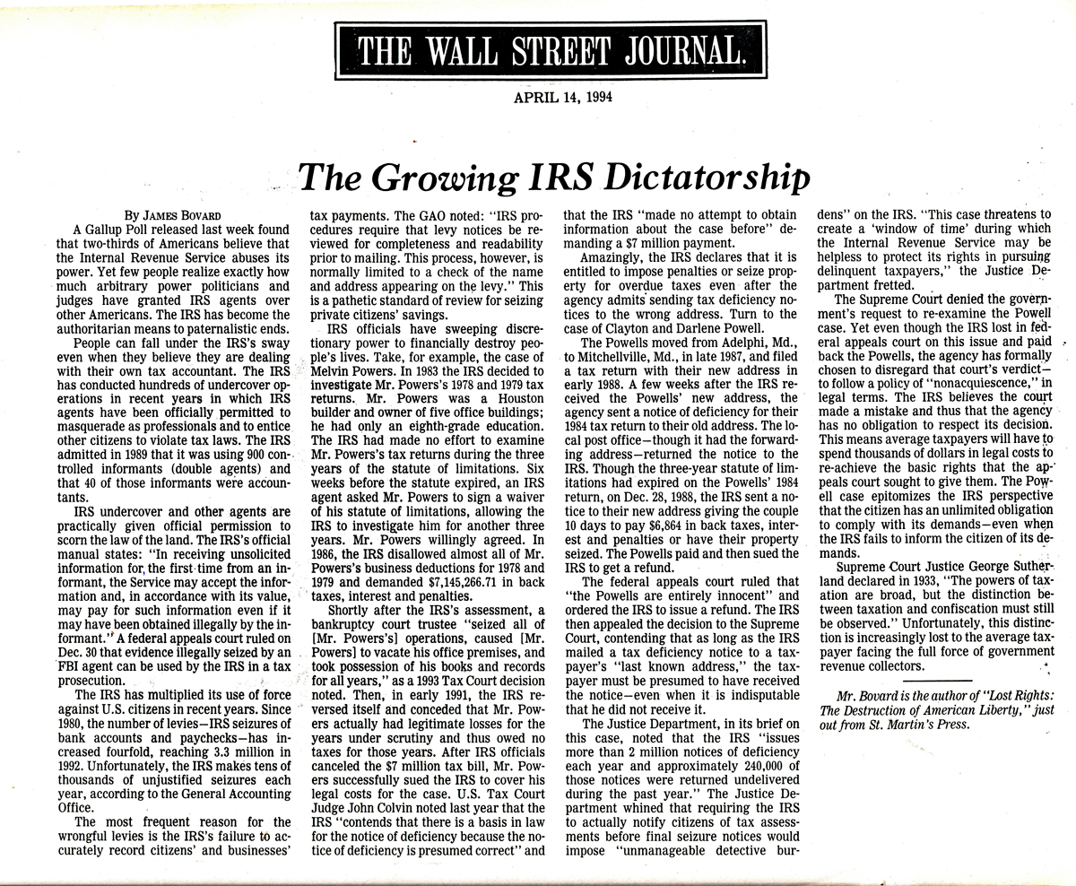 On Tax Day 2026, remember that the IRS was unleashed long ago. Here’s a piece of mine published on April 14, 1994 –