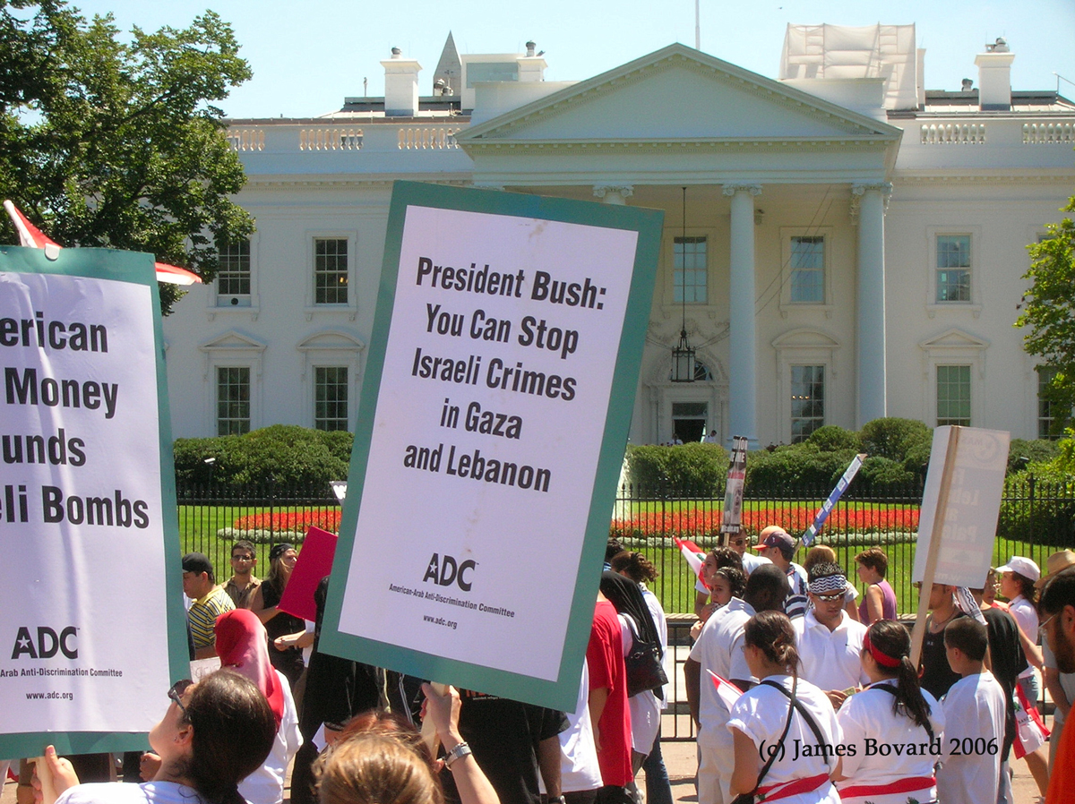 There were plenty of Arab Americans on the scene who were confounded to see the U.S. government supporting the attacks on their kinfolks. The sign in front of the White House reflects perhaps naïve optimism that President George W. Bush would do anything to stop the bombing.