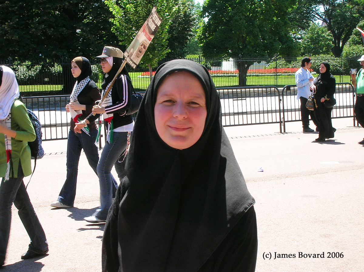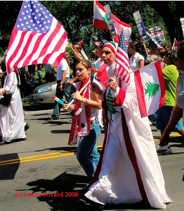 On August 12, 2006, thousands of people gathered near the White House to protest American support for the Israeli attacks on Lebanon. While some zealots portrayed Arabs as innately hostile to the United States and its allies, this photo I snapped of a mother and daughter marching along captured the all-American reality of many supporters of Lebanon. The mother is wearing traditional Lebanese garb and carrying both a U.S. flag and a Lebanese flag. The daughter is soaking up the scene while chomping on a popsicle. This is a pair that would have fit in with practically any American Fourth of July celebration.
